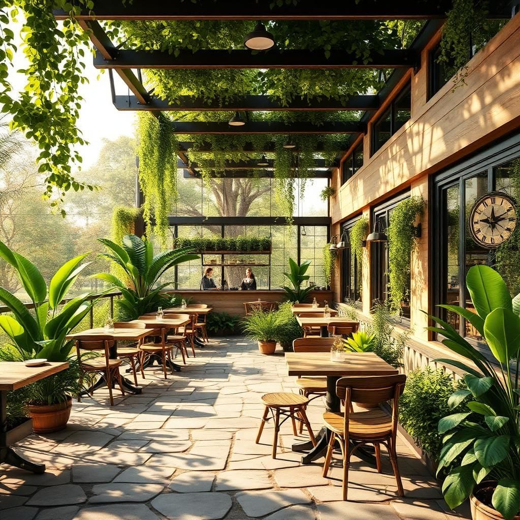 Thiết kế quán cafe xanh: sử dụng nhiều cây xanh, không gian mở, ánh sáng tự nhiên.